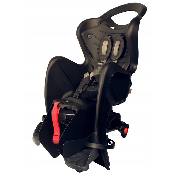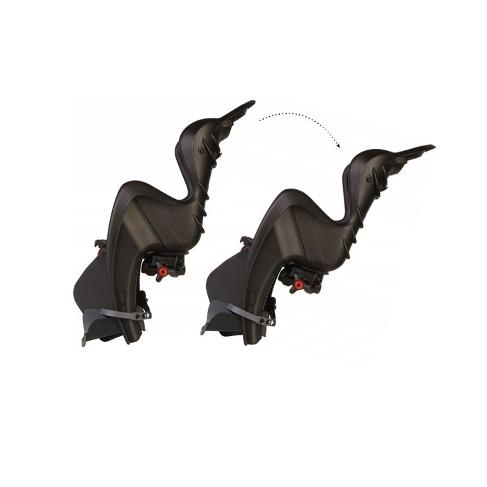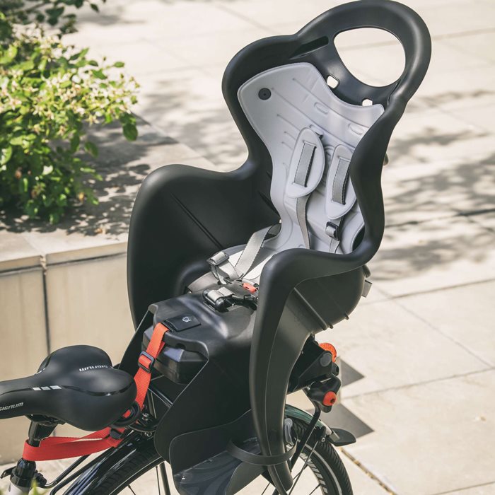 Cykelsits för barn upp till 22 kg (ca 7 år). Fällbar sits, med enhandsfattning, för maximal komfort. Monteras på pakethållaren, passar de flesta elcyklar. Stort utrymme för hjälmen. Grå dyna och axelskydd i tvättbart, vattenavvisande och ekologiskt konstläder. Barnsäkert spänne som är enkelt att sätta dit och ta bort med endast en hand. Selen kan justeras i höjd, längd och djup. Justerbara fotstöd, helgjutet fotskydd skyddar mot hjulets ekrar. Fäste för pakethållare från bredd 120 mm - 175 mm.