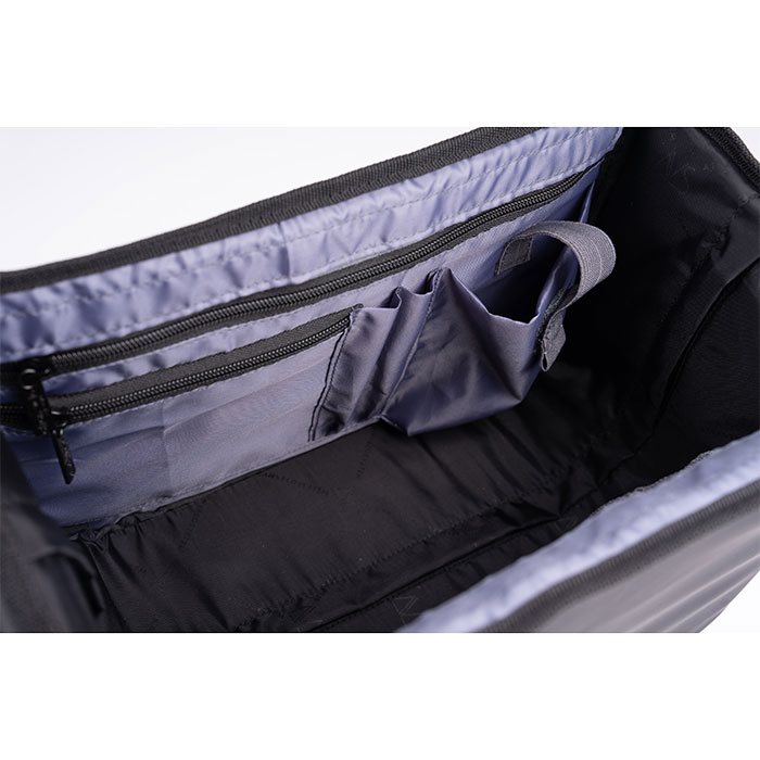 Mindre fickor och flaskhållare. Magnetiskt spänne, robust handtag och avtagbar axelrem.
